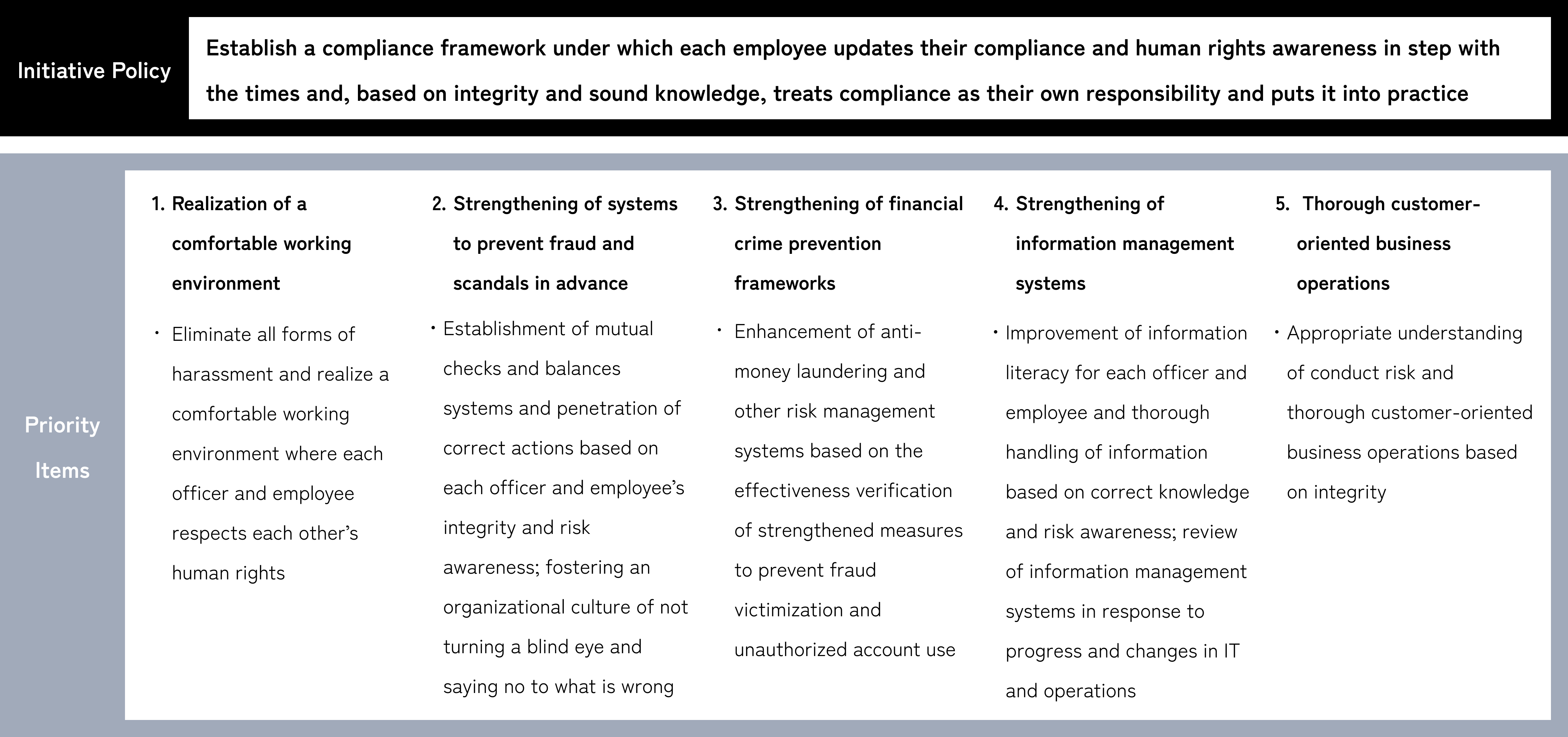 For the fiscal year ending March 31, 2026, we have established an approach that emphasizes the awareness and actions of officers and employees, focusing on up-to-date compliance and human rights awareness, judgment and conduct based on integrity, risk-based thinking, and acting as one’s own responsibility, while continuing to instill basic knowledge of laws and regulations.