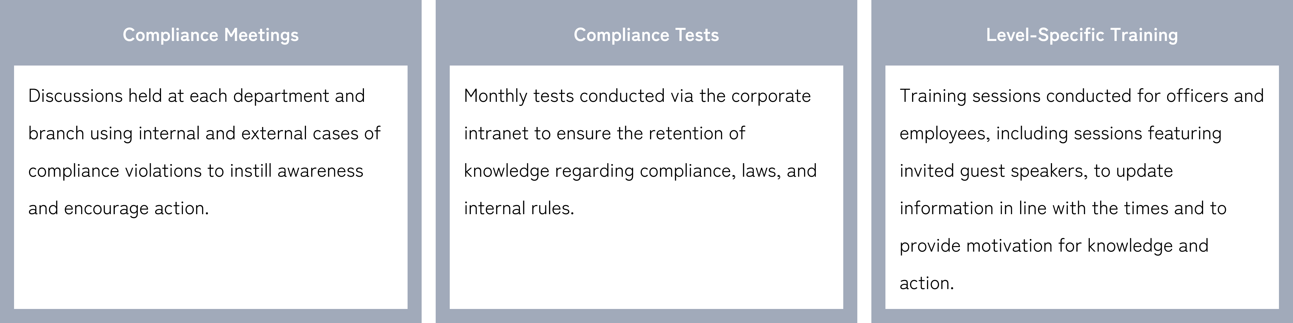 To ensure appropriate compliance, the Group has established the compliance administration department, and conducts the development of compliance-related system and training for officers and employees. The Compliance Administration Dept. liaises with the compliance administration department of each group company, and centrally manages compliance matters throughout the Group.