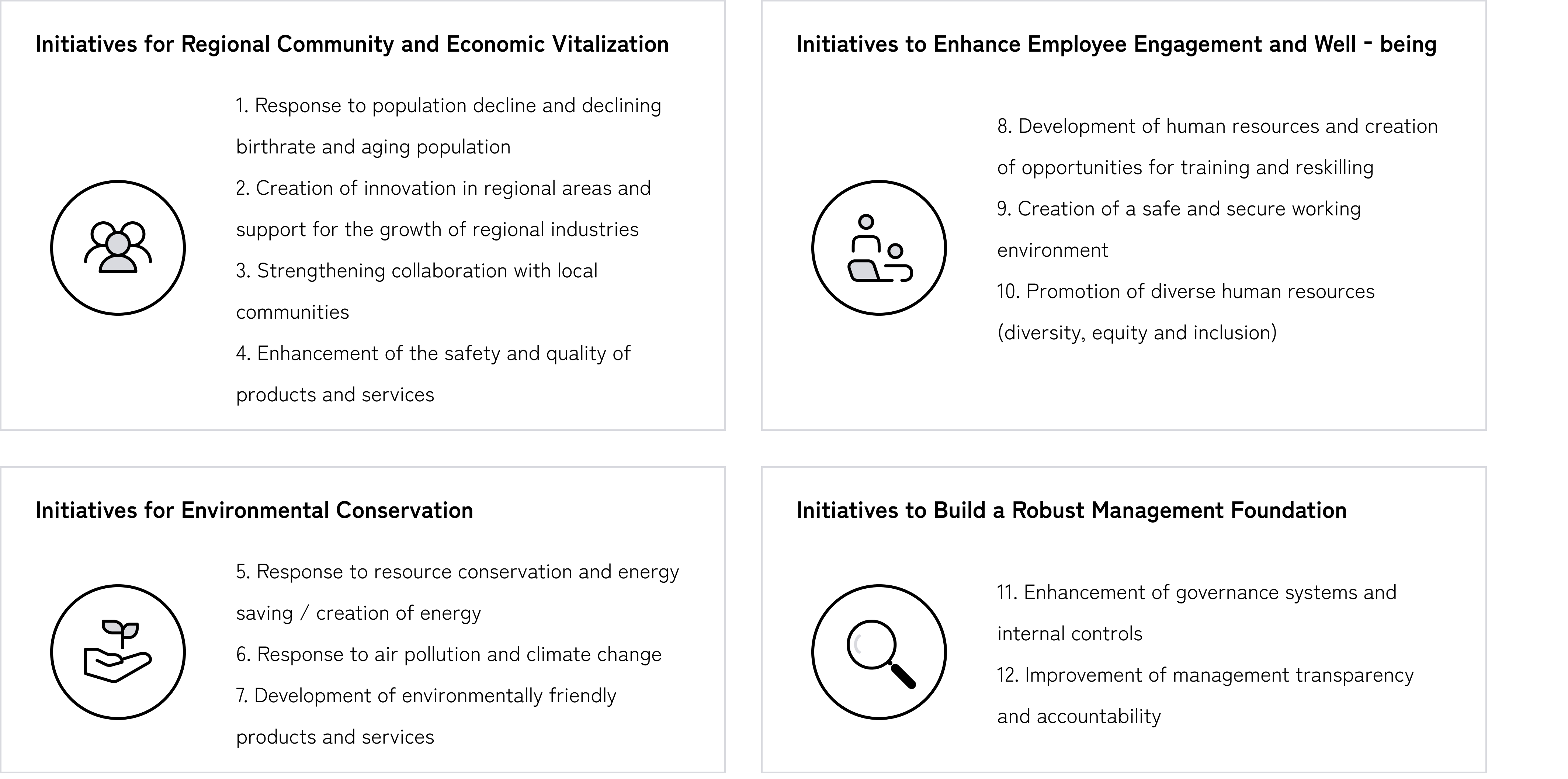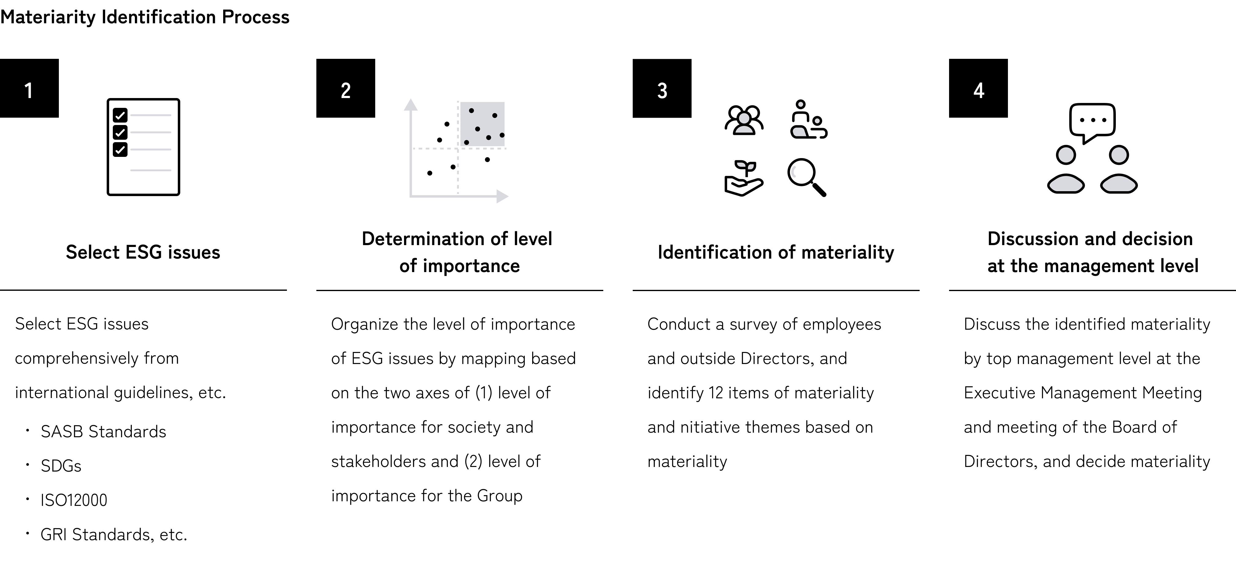 Through its business activities conducted in accordance with the Group Sustainability Policy, the Group will proactively work to address the following 12 material issues.
