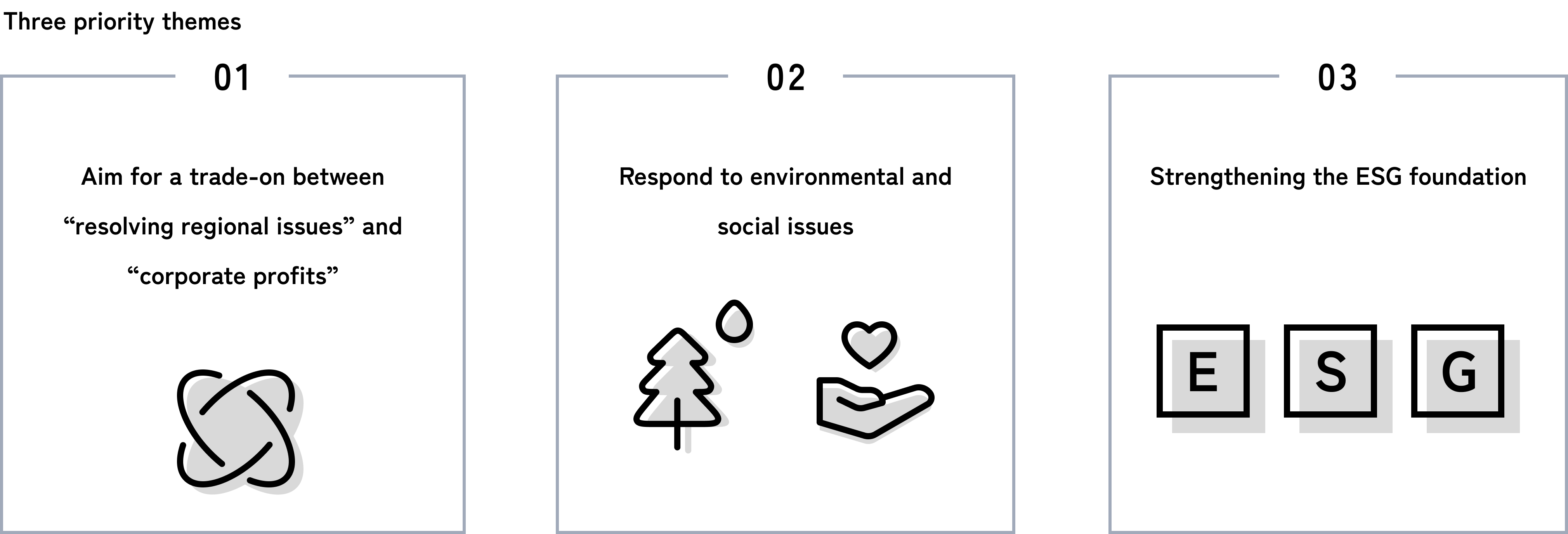 By steadily promoting three priority themes in our sustainability strategy, we will deepen sustainability management, leading to an increase in corporate value.