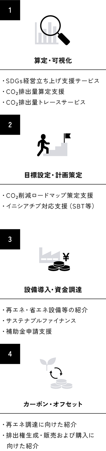 当社グループは、気候変動への社会的な対応を機会と捉え、お客さまのカーボンニュートラルへの取り組みを支援するため、GHG削減に向けた様々な金融・非金融ソリューションを提供しています。