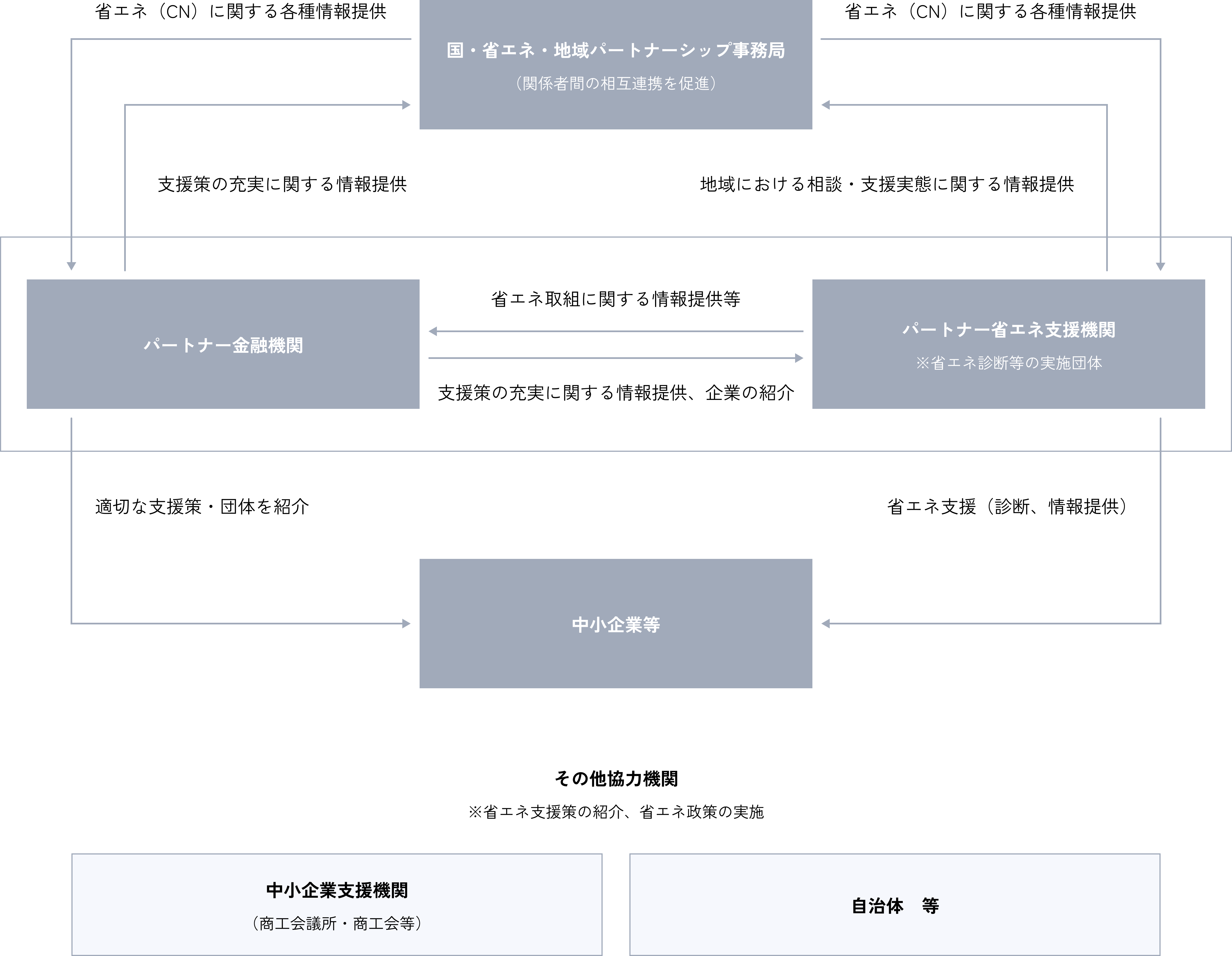 当行は資源エネルギー庁や本パートナーシップに参加している団体と連携を図り、補助金等の情報提供や省エネ診断等を含むコンサル機会を提供し、地域のお客さまの省エネ活動を支えてまいります。