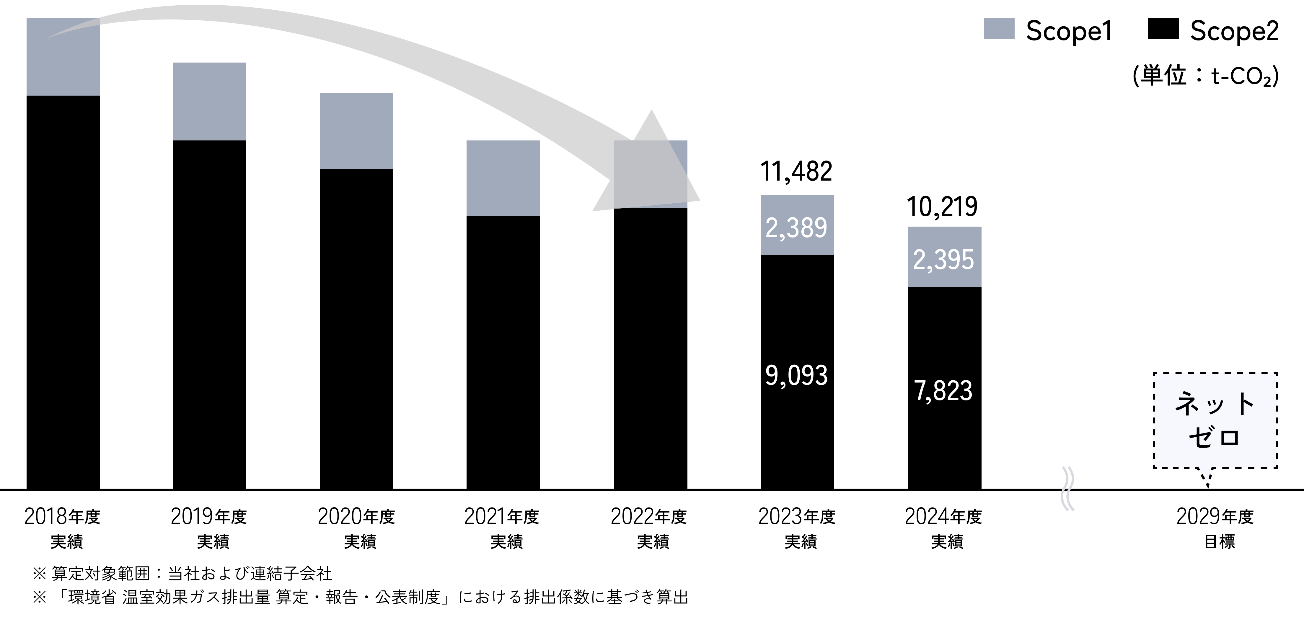 当社グループは、当社グループ自身のカーボンニュートラル達成に向けて、2022年11月に中長期目標として「2030年度までにCO2排出量(Scope1、2)ネットゼロ」を公表し、CO2排出量の削減に取り組んでいます。また、2025年度よりスタートしたYMFG中期経営計画(2025年度~2029年度)においては、最終年度である2029年度に1年前倒しでCO2排出量(Scope1、2)ネットゼロを達成することを目指しています。