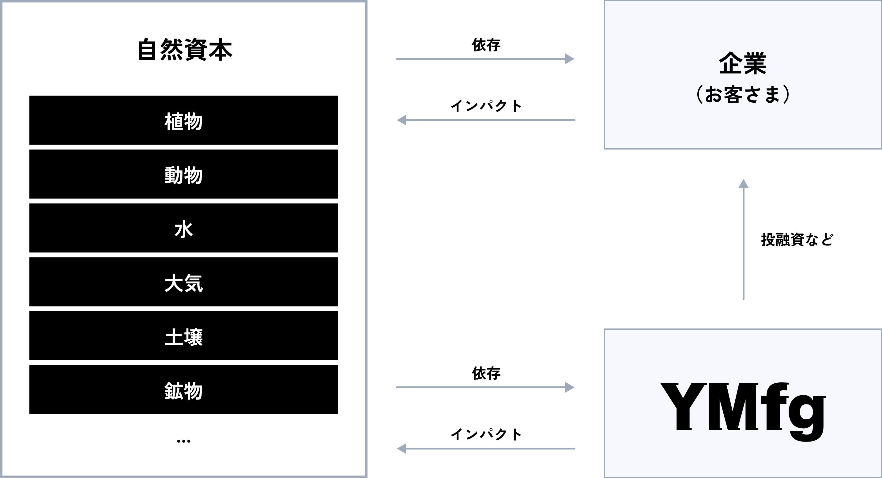 自社の事業活動における資源利用や環境負荷に加え、投融資を通じて関与する企業のバリューチェーン全体においても、自然資本への依存とインパクトが生じています。