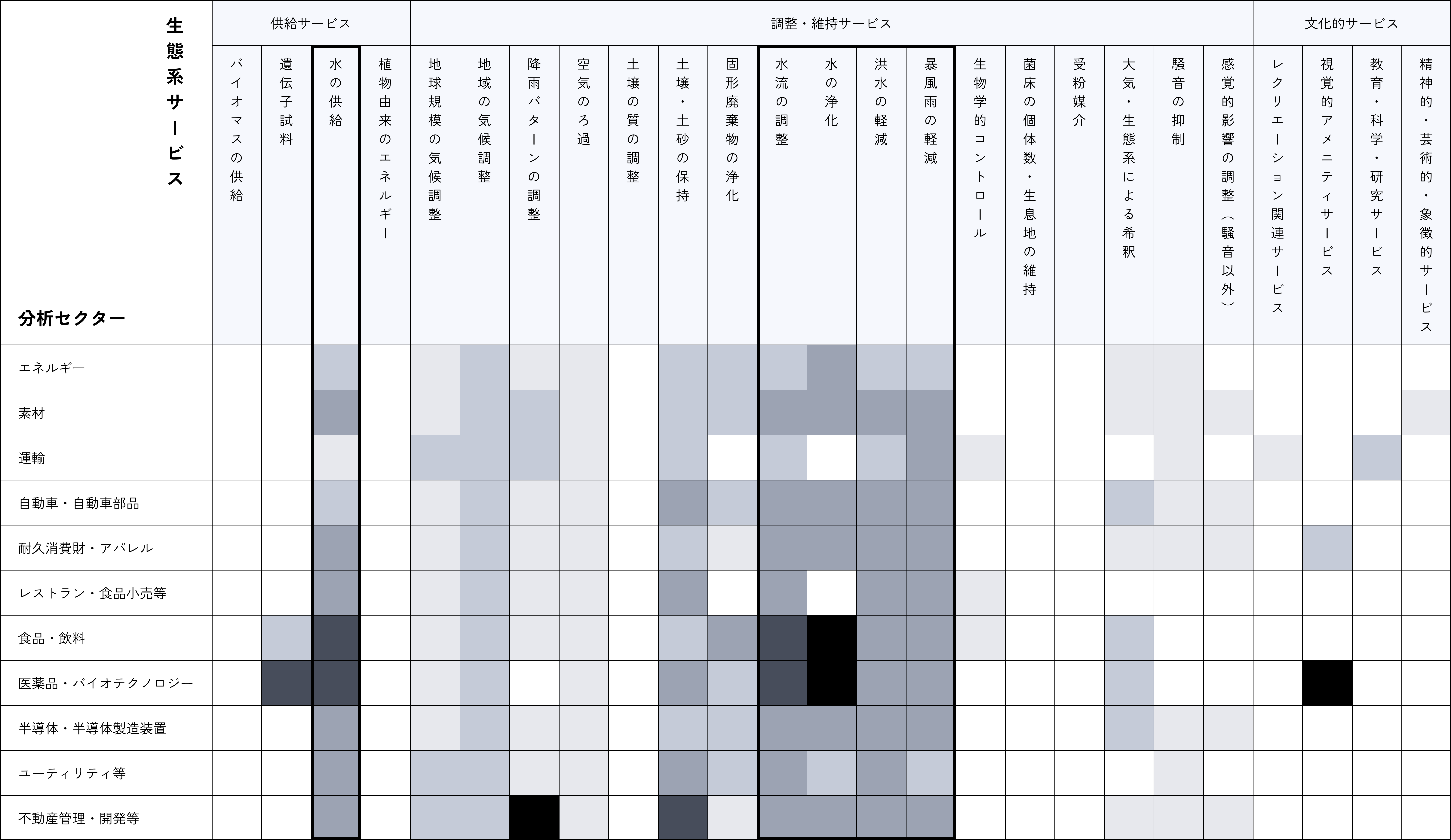 分析の結果、融資ポートフォリオの傾向として、「依存」については「水」関連の生態系サービスへの依存が大きいこと、「インパクト」については「水・土壌への有害汚染物質の排出」や「攪乱(騒音・光など)」に対する影響が大きいことが分かりました。