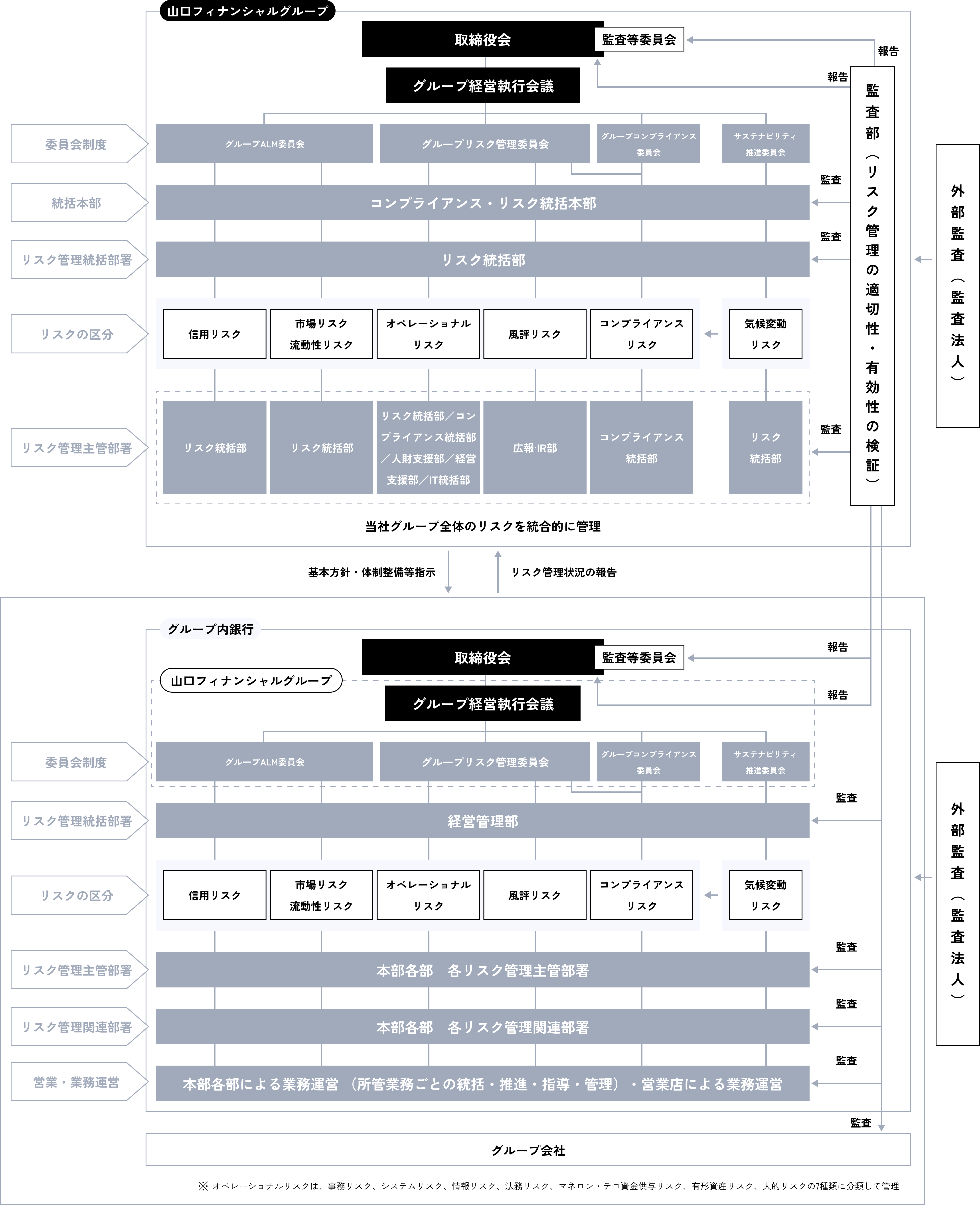 また、各委員会にて審議された重要事項は、グループ経営執行会議を経て取締役会に報告がなされ、監督が行われます。なお、リスク管理の適切性について、業務部門から独立した内部監査部門による監査を実施しています。