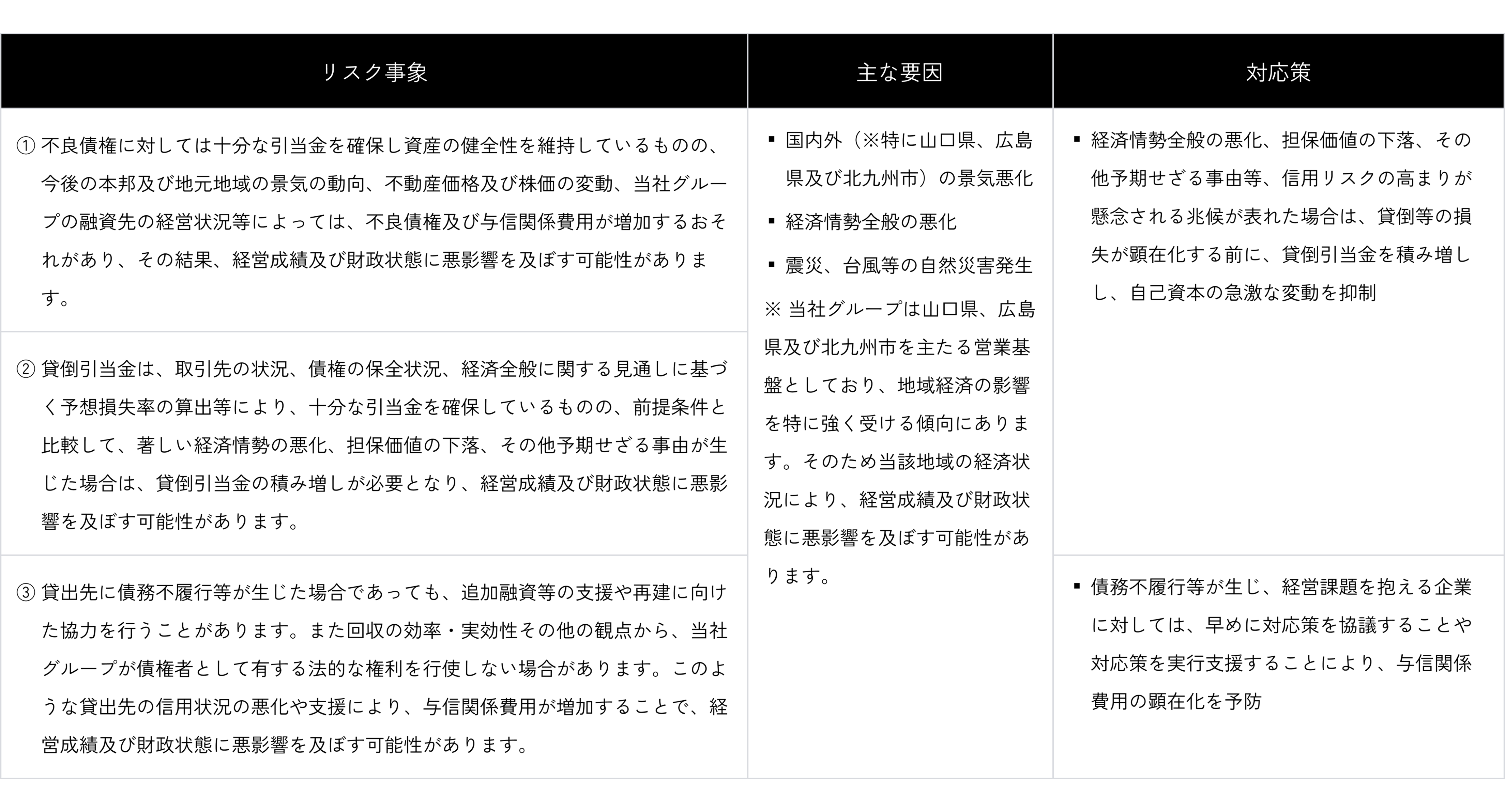 ※当社グループは山口県、広島県及び北九州市を主たる営業基盤としており、地域経済の影響を特に強く受ける傾向にあります。そのため当該地域の経済状況により、経営成績及び財政状態に悪影響を及ぼす可能性があります。 |