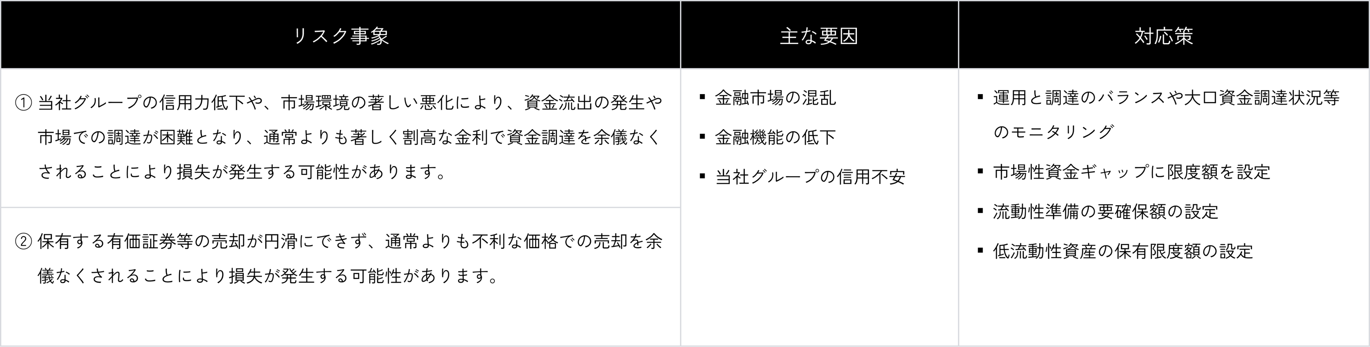 流動性リスクとは、銀行の財務内容の悪化等により必要な資金が確保できなくなり、資金繰りがつかなくなる場合や、資金の確保に通常よりも著しく高い金利での資金調達を余儀なくされることにより損失を被るリスク(資金繰りリスク)と、市場の混乱等により市場において取引ができなかったり、通常よりも著しく不利な価格での取引を余儀なくされたりすることにより、損失を被るリスク(市場流動性リスク)。主なリスク事象、要因および対応策は以下のとおりで、1は発生時の当社グループへの影響が大きいと認識しています。