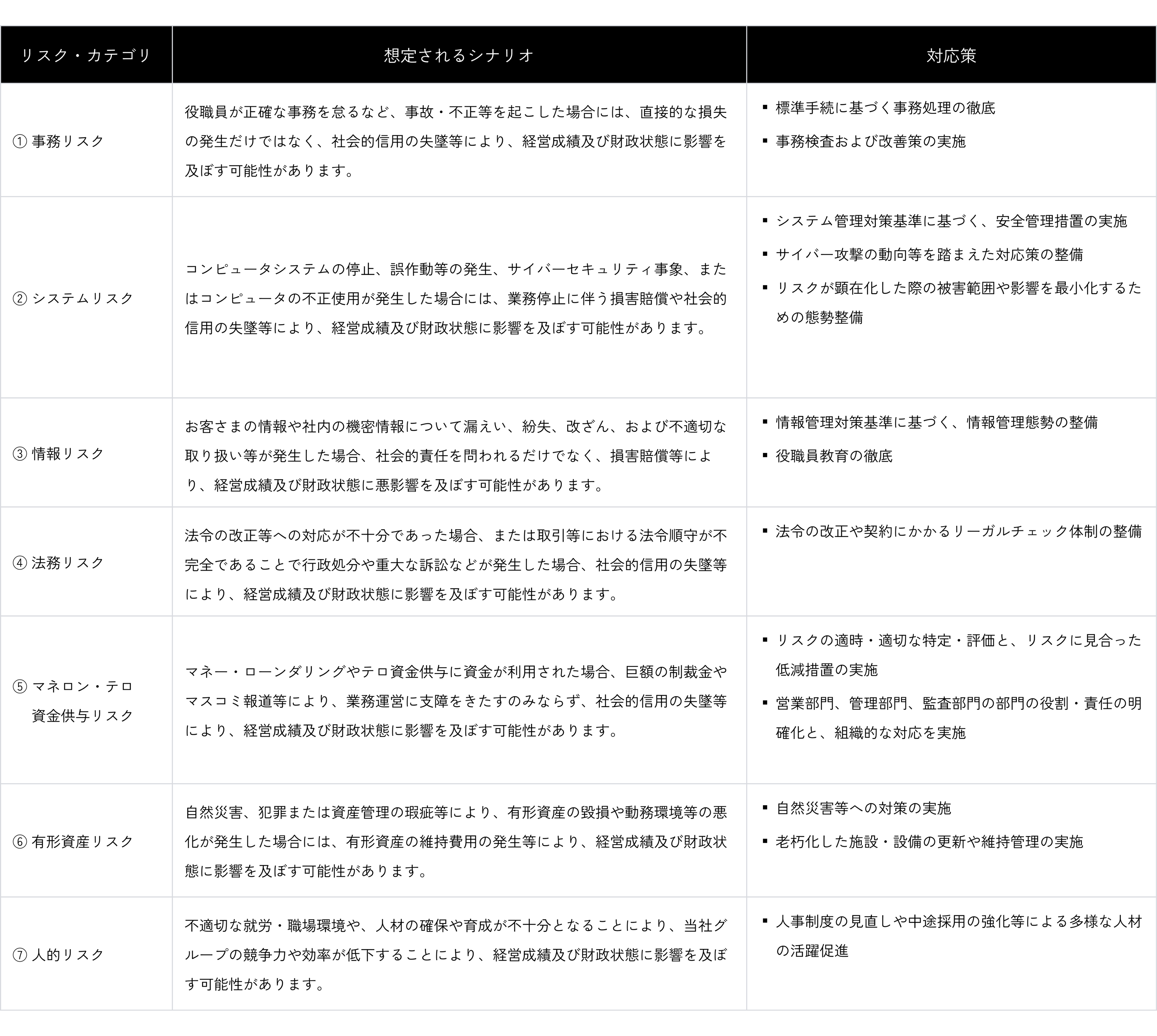 具体的には、信用リスク、市場リスク、流動性リスク、オペレーショナル・リスク等のリスクに対して、各々のリスクの主管部署を定め、リスクの種類ごとに当社グループ全体のリスク状況を把握・分析ならびに評価し、管理するとともに、経営レベルの会議体である「グループALM委員会」、「グループリスク管理委員会」、「グループコンプライアンス委員会」、「サステナビリティ推進委員会」、「グループ経営執行会議」にて対応策等を協議することで、各種リスクを統合的に管理する態勢としています。