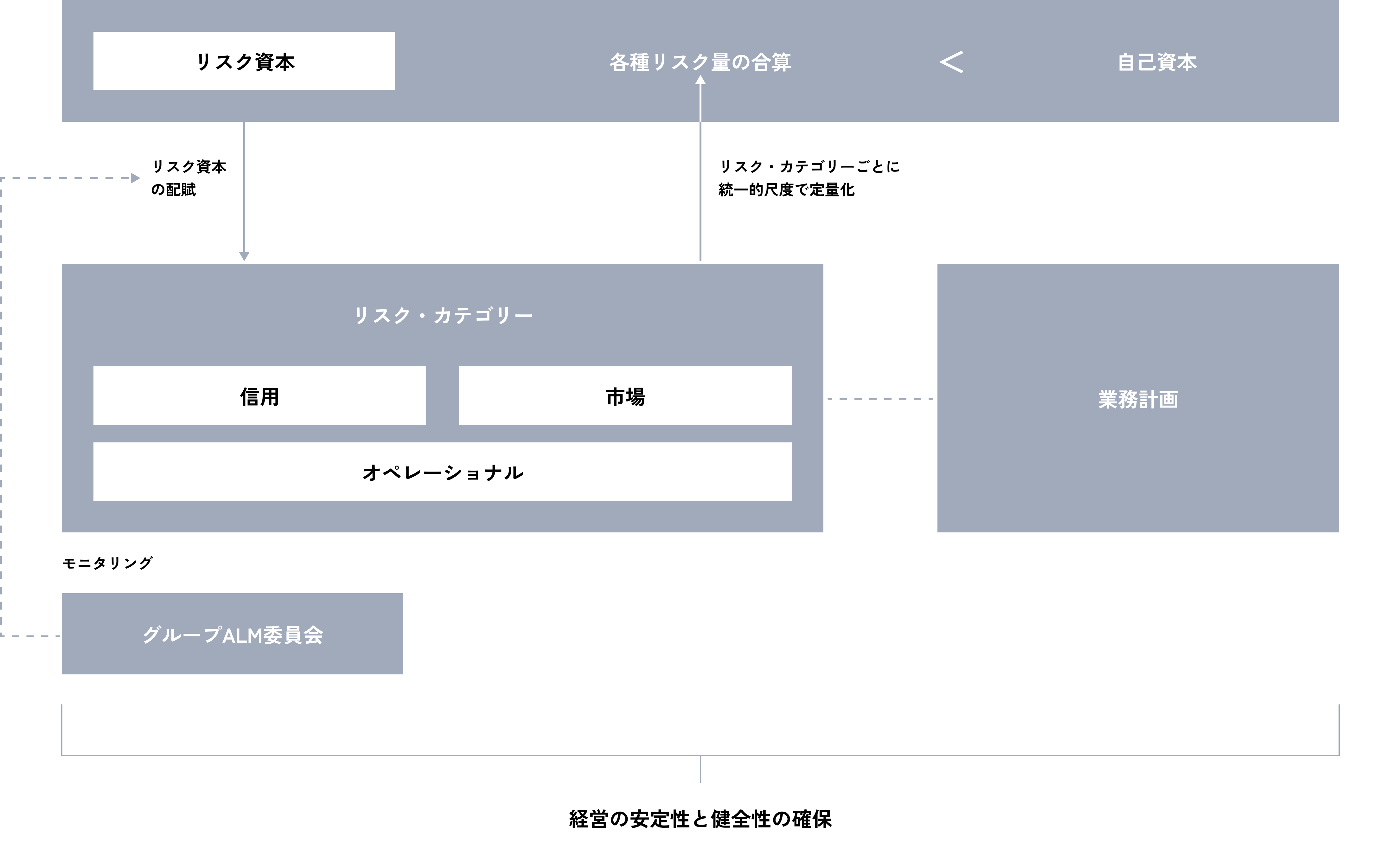 なお、各リスク・カテゴリー、取引等への資本の配賦額については、業務計画の策定において、グループ経営執行会議にて審議・決議し、リスク資本の使用状況・遵守状況のモニタリングについては、グループALM委員会にて行っています。