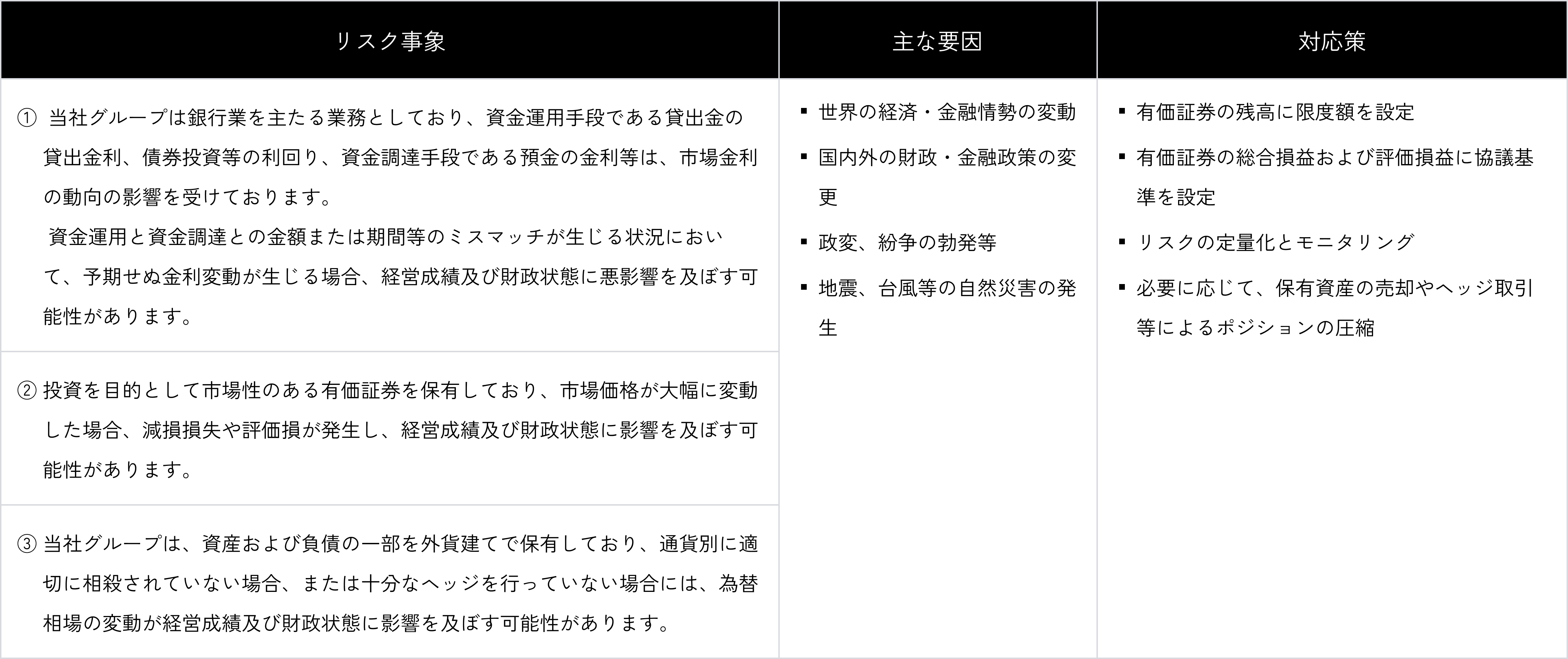 市場リスクとは、金利、有価証券等の価格、為替相場等の様々な市場のリスク・ファクターの変動により、保有する資産、負債、およびオフバランス取引の価値が変動し、損失を被るリスク。その主なリスク事象、要因および対応策は以下のとおりで、1、2は発生時の当社グループへの影響が大きいと認識しています。