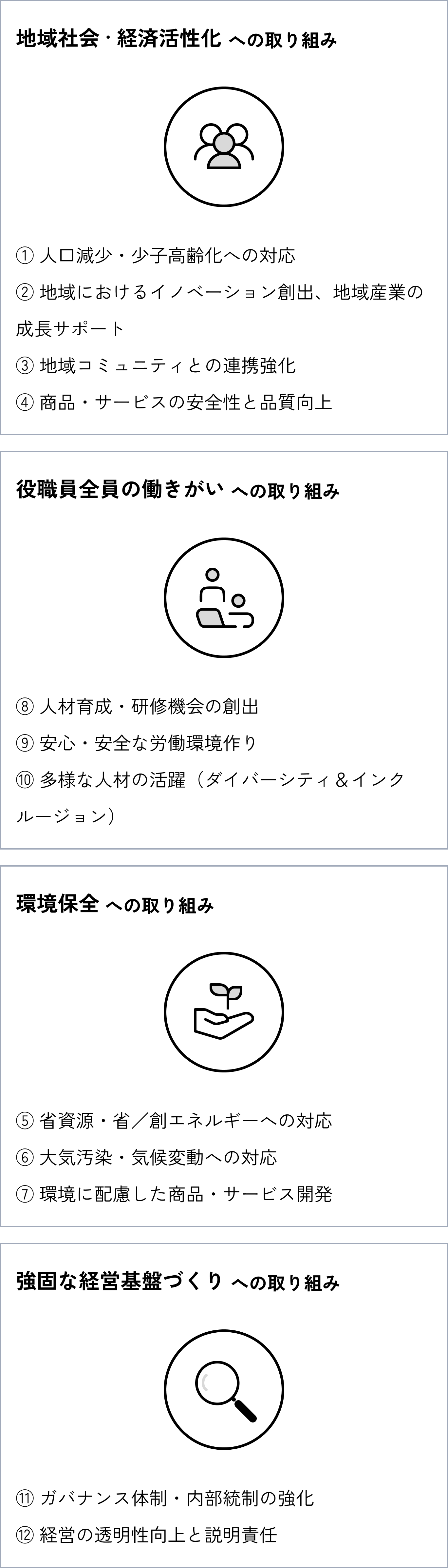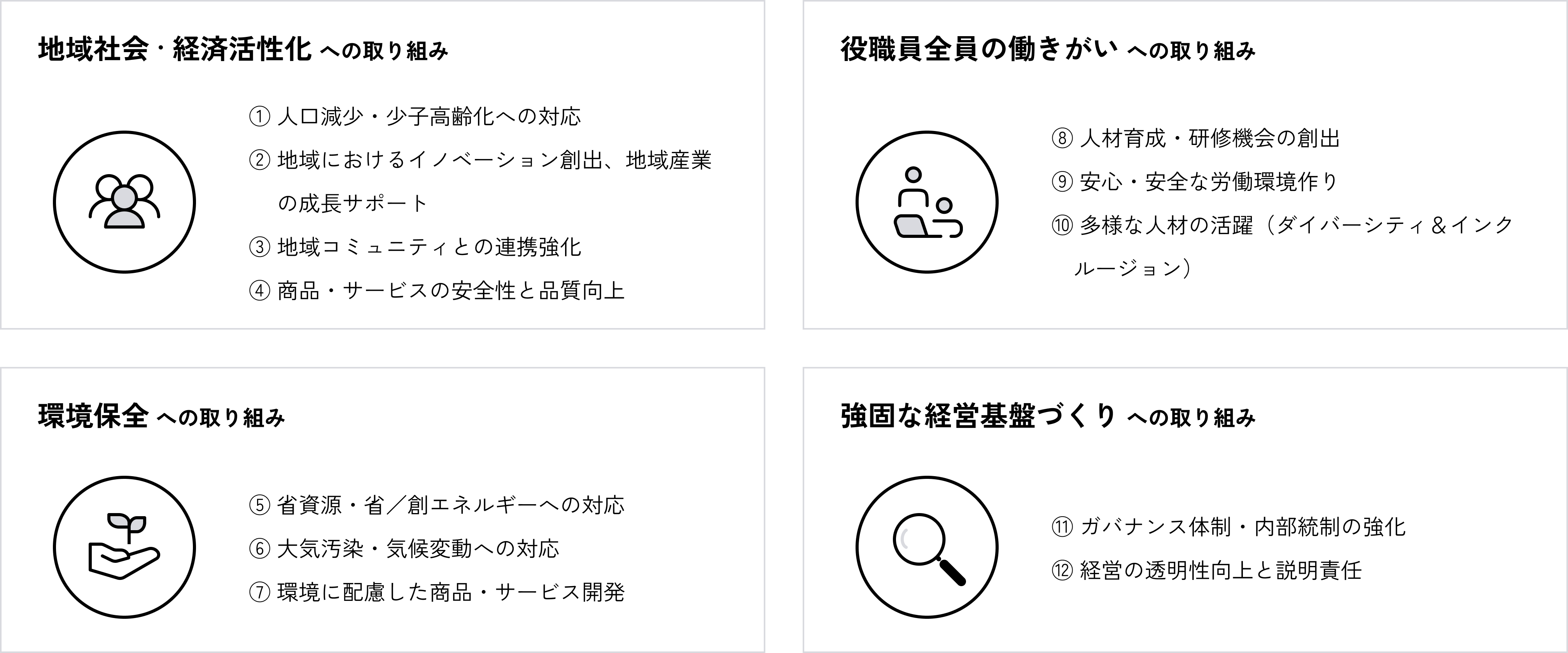 グループサステナビリティ方針に基づく事業活動をとおして、以下12項目のマテリアリティの解決に積極的に取り組んでいきます。