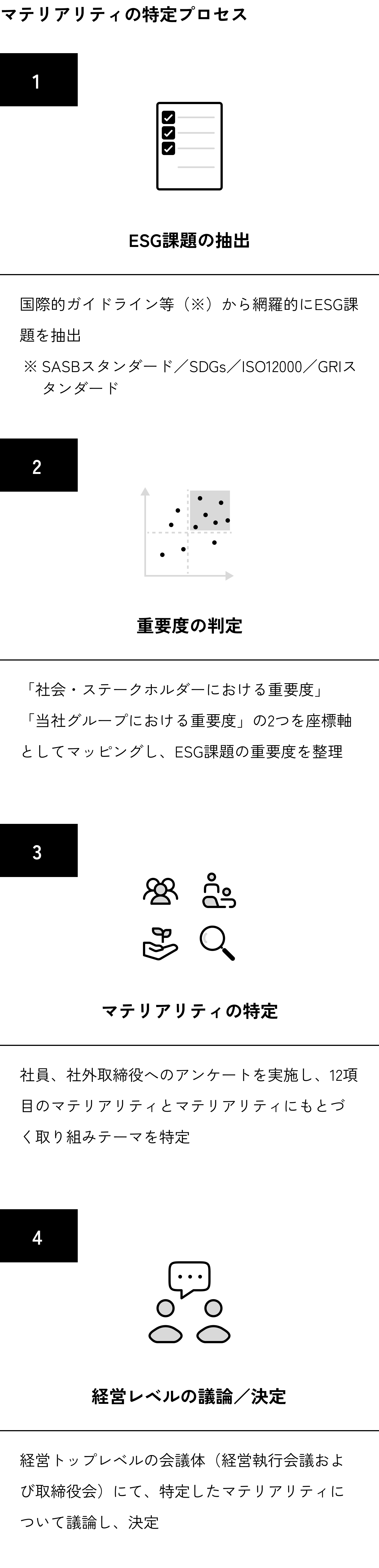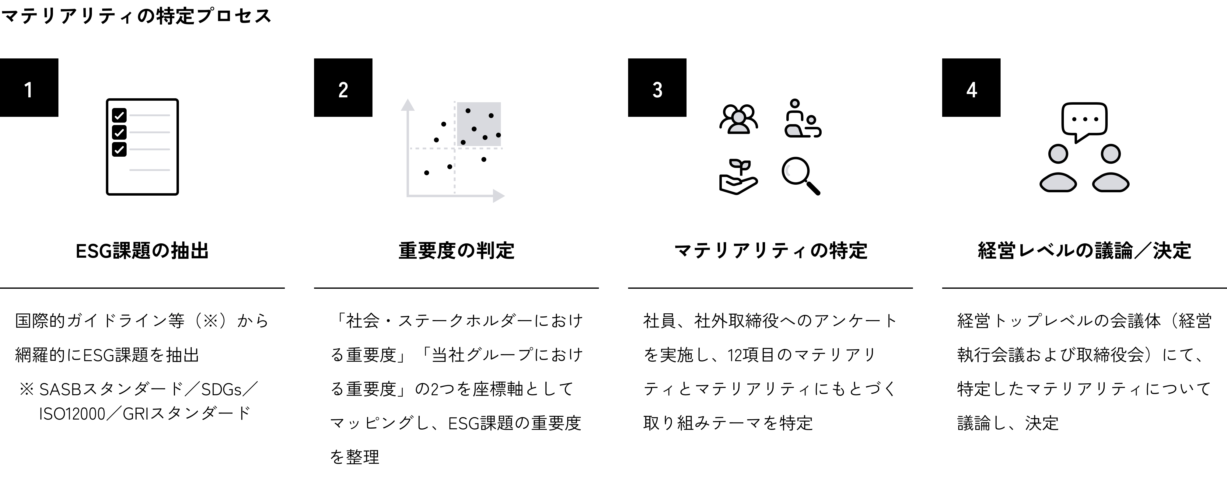 当社グループは、持続可能な社会の実現に貢献するために、特に重点的に取り組むべきESG課題「マテリアリティ」を特定しています。