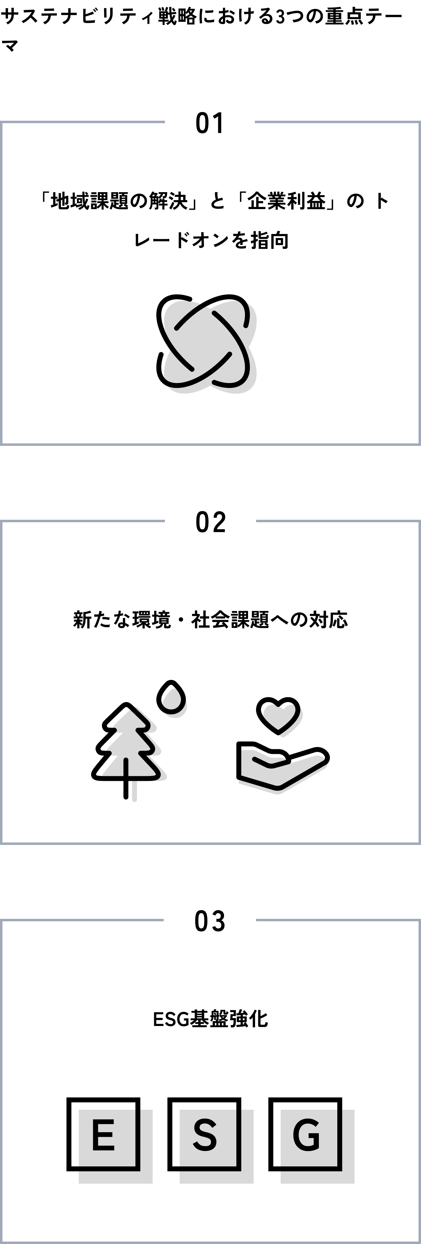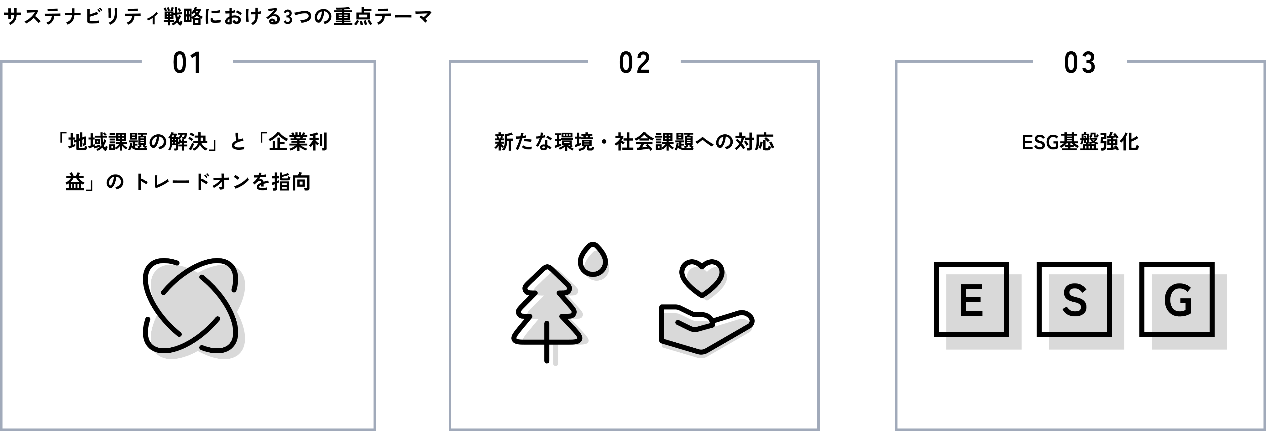 サステナビリティ戦略における3つの重点テーマの取り組みを着実に推進することでサステナビリティ経営を深化させ、企業価値の向上につなげていきます。